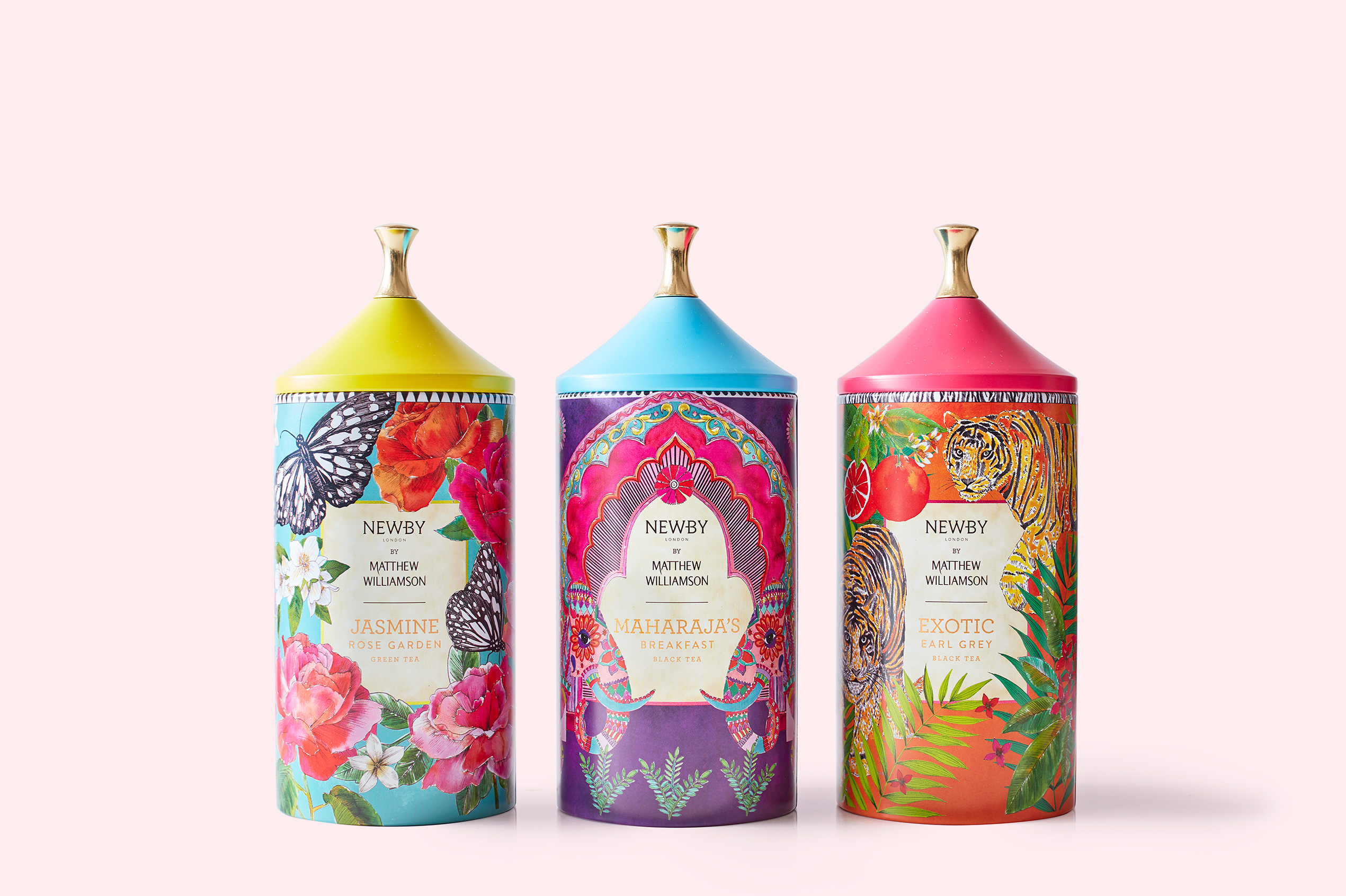 Newby by Matthew Williamson presents three fine, loose-leaf teas in eye-catching caddies illustrated by the designer. The colours and characters of the three new and exclusive tea blends – Jasmine Rose Garden, Maharaja’s Breakfast and Exotic Earl Grey are also reflected in the elaborate artwork.